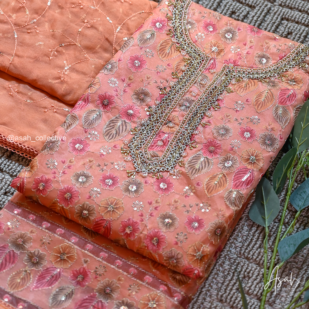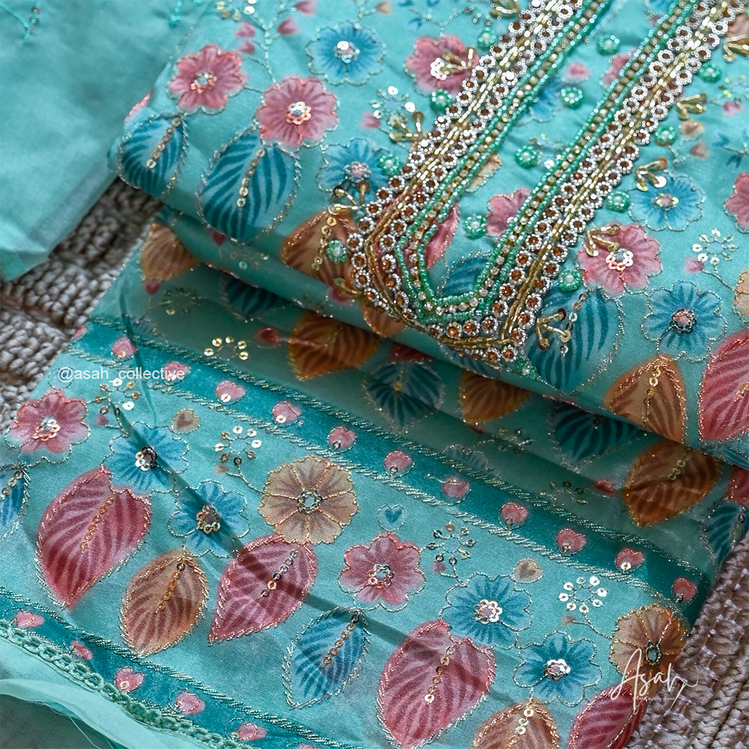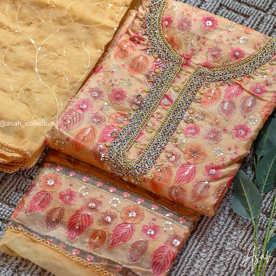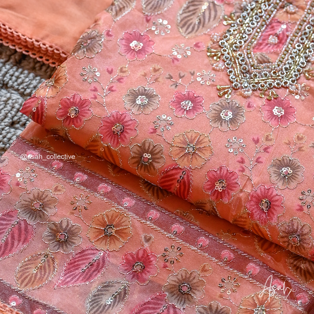 Organza material with beautiful floral embroidery and detailed neckline work.