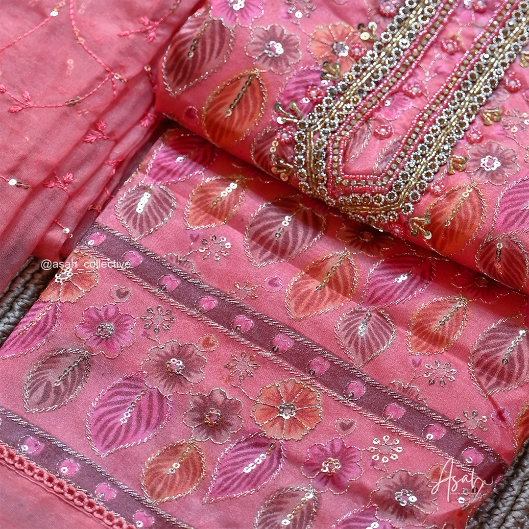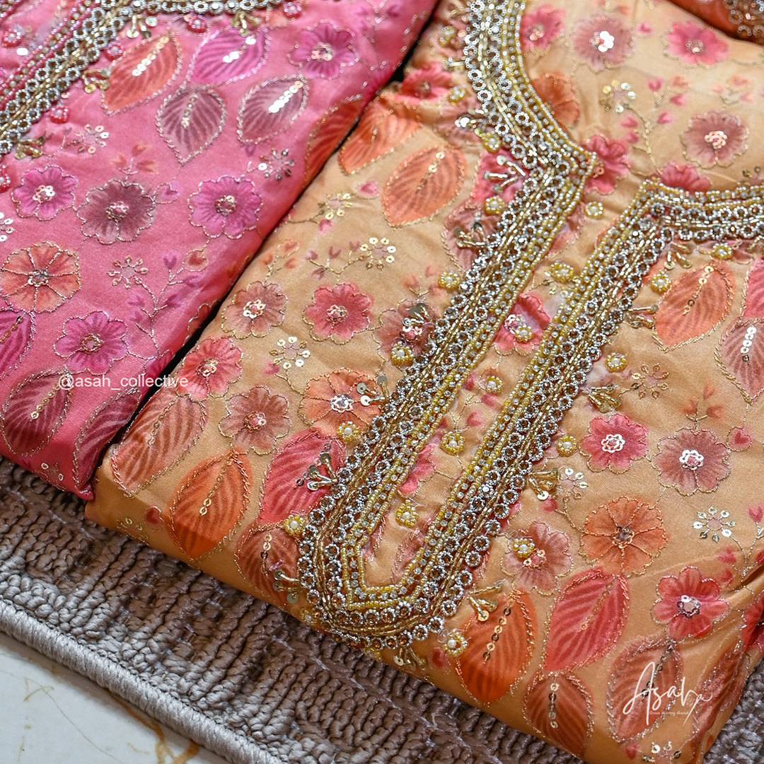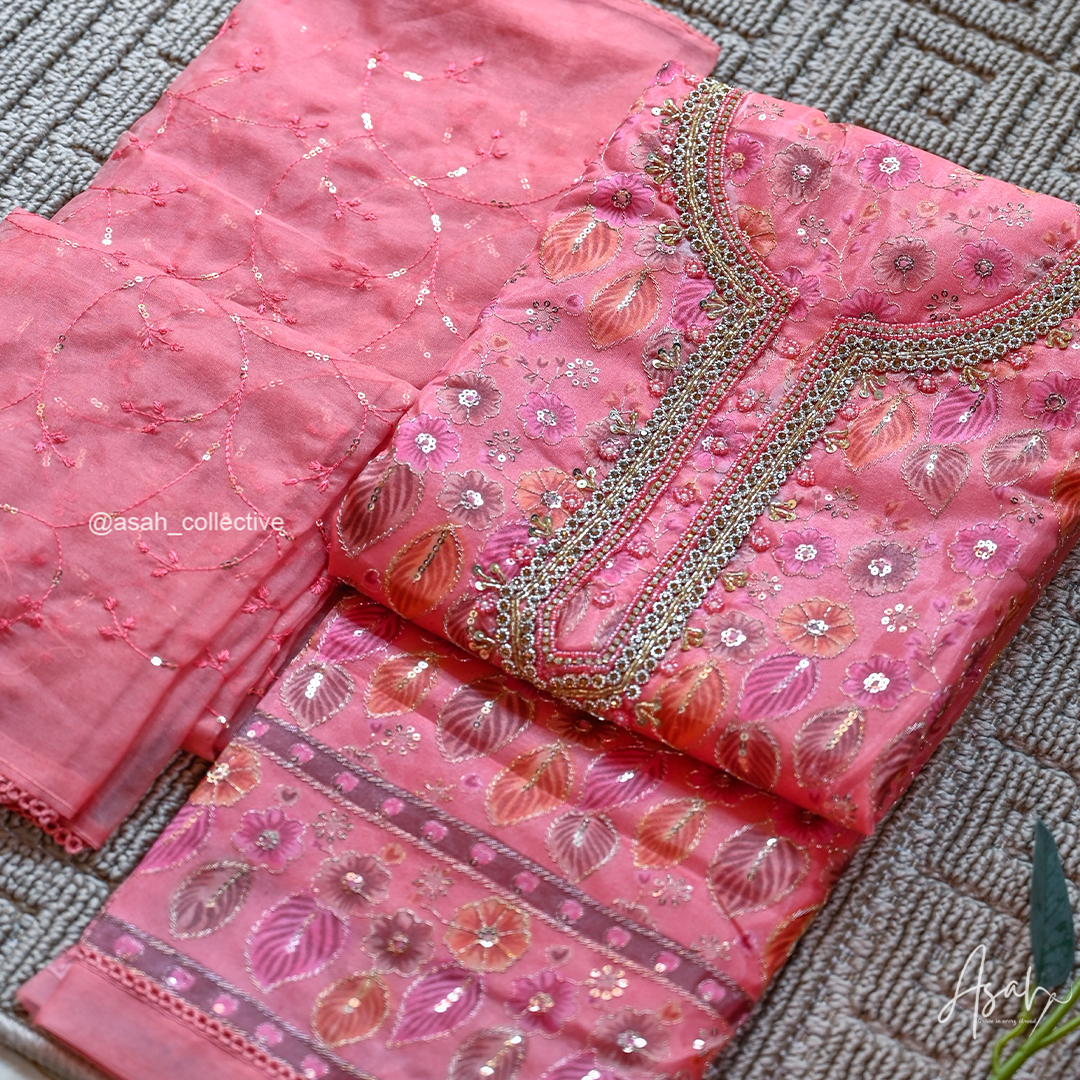 Organza material with beautiful floral embroidery and detailed neckline work.