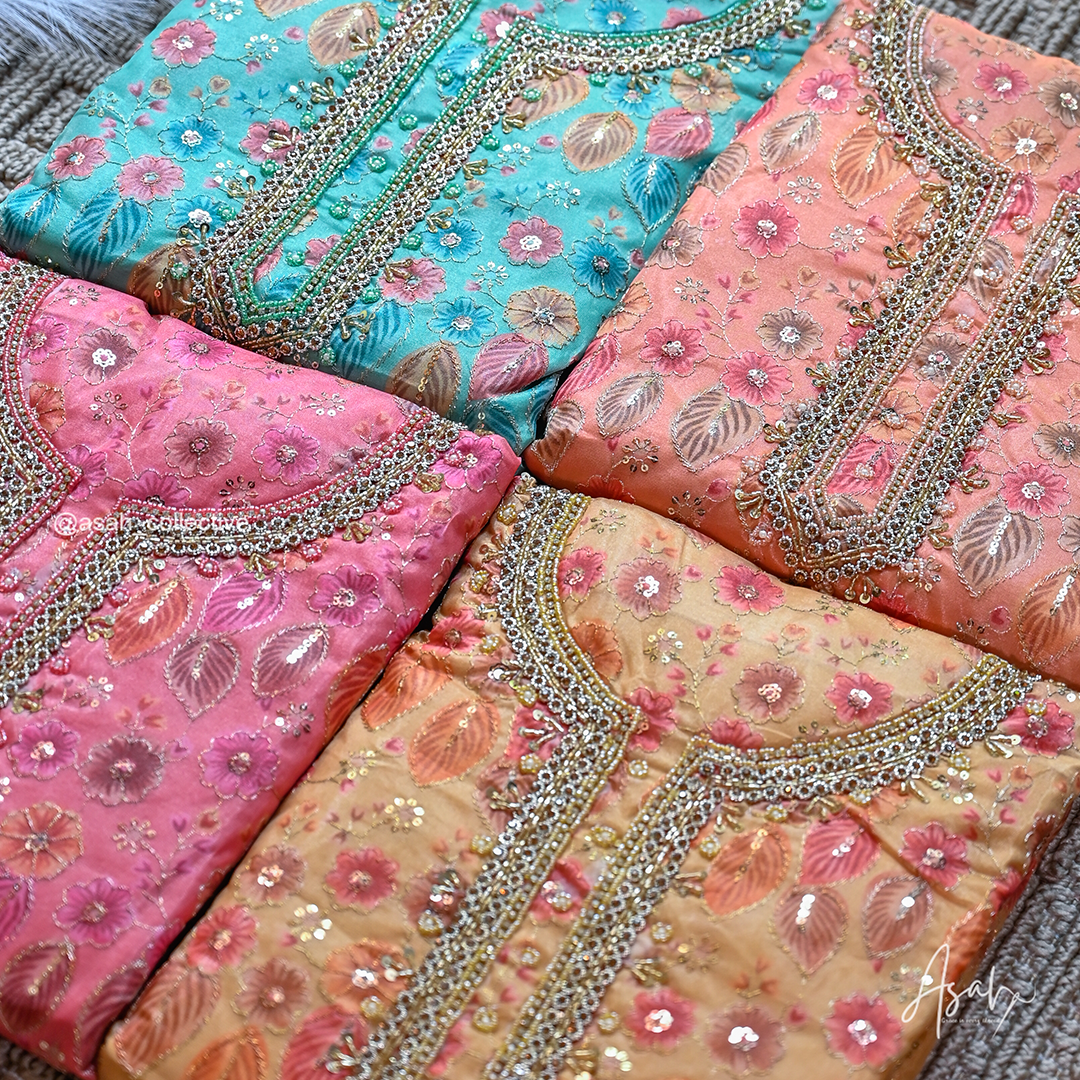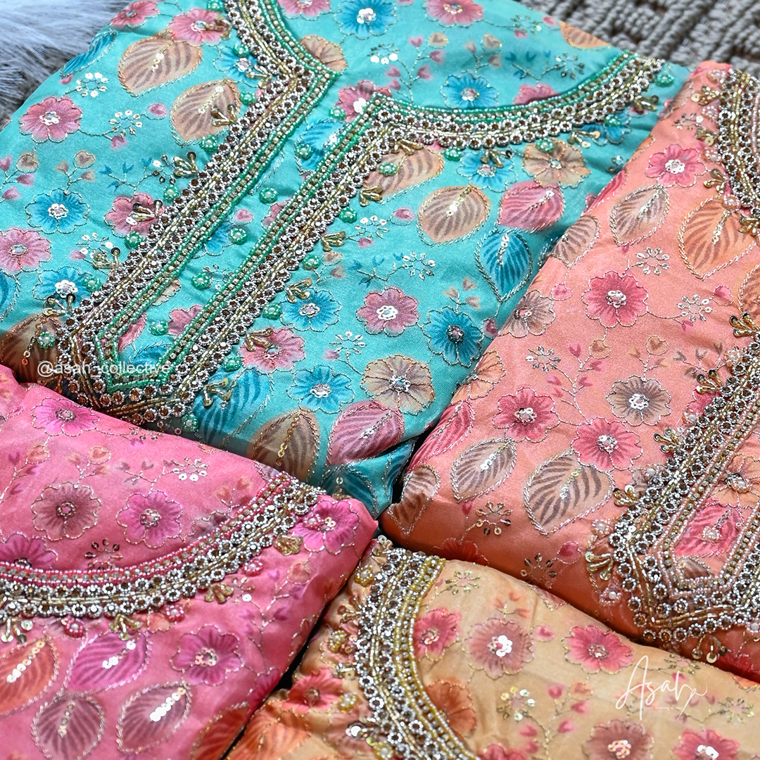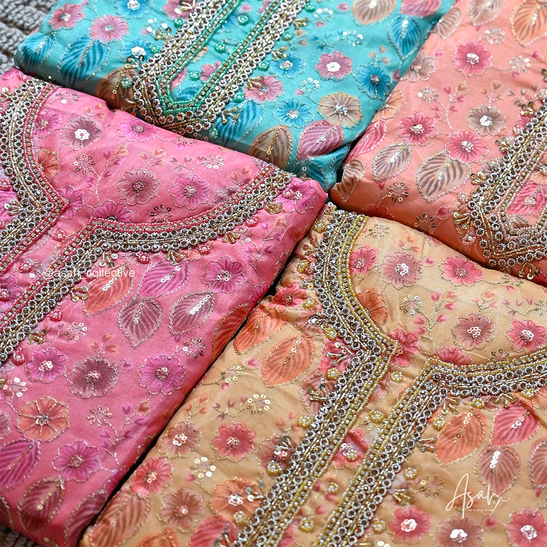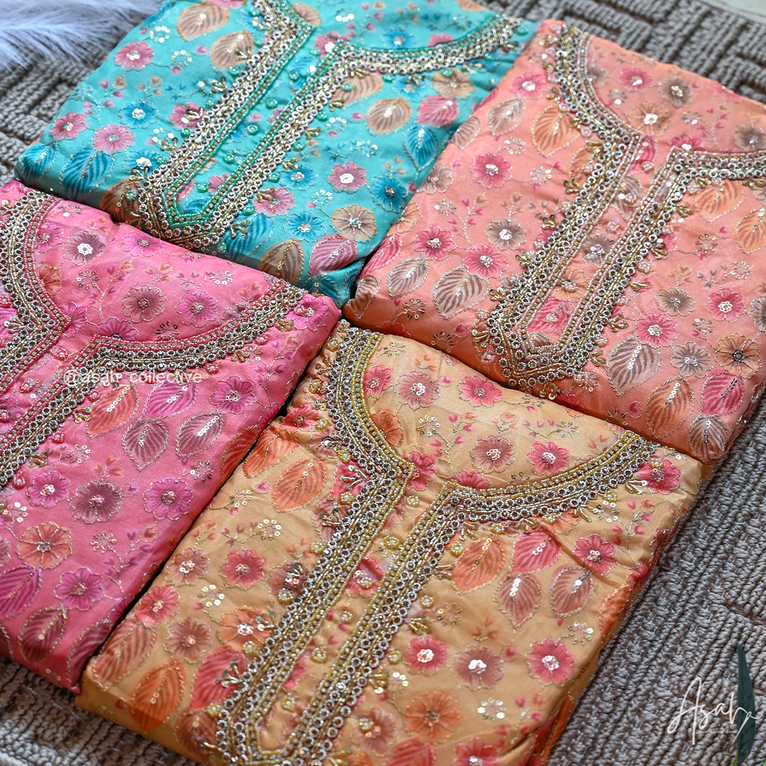 Organza material with beautiful floral embroidery and detailed neckline work.