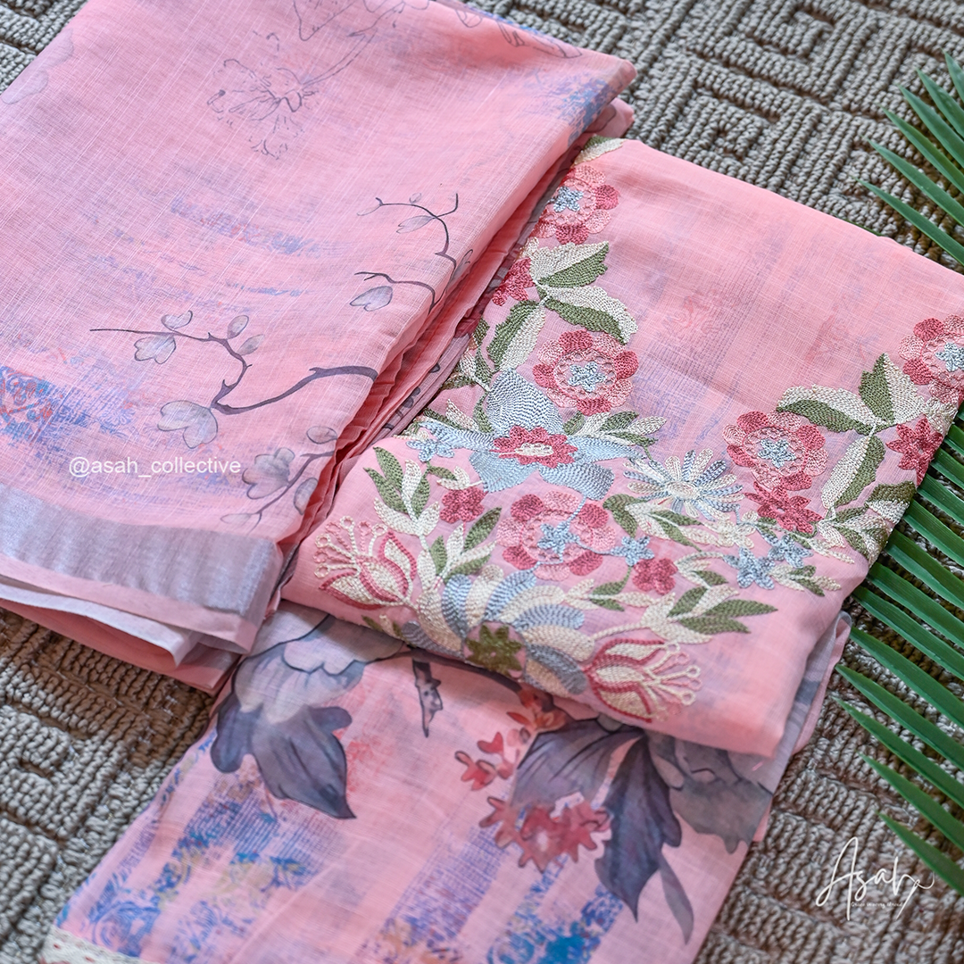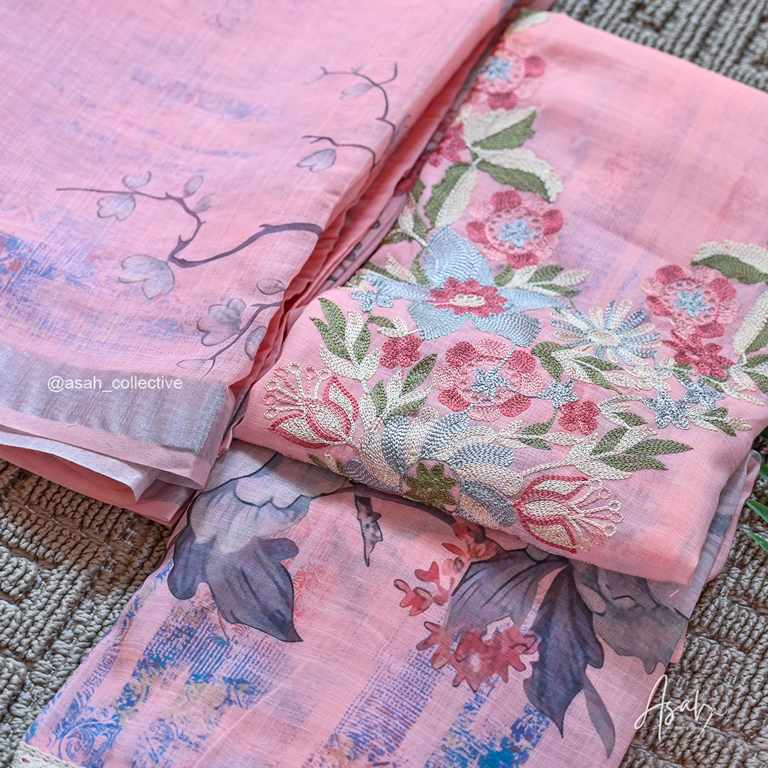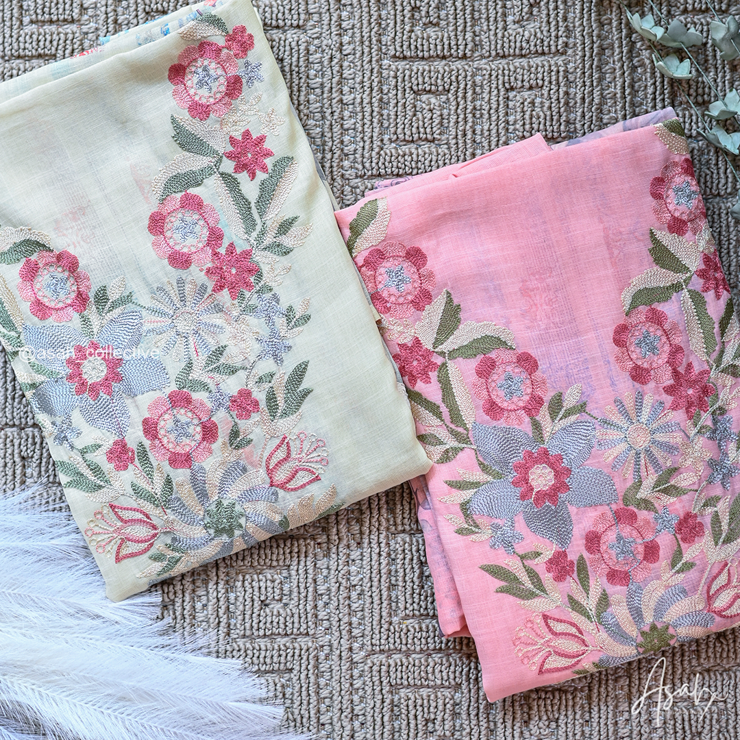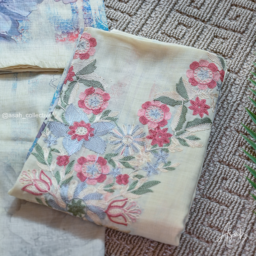 Soft cotton material with elegant V-neck silver embroidery, paired with a digital print dupatta and soft cotton bottom.