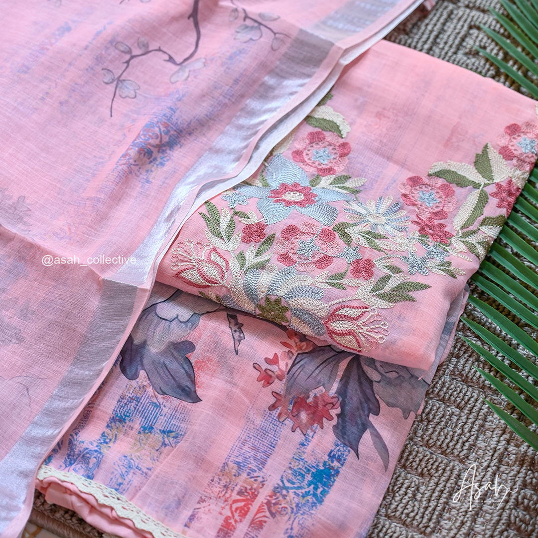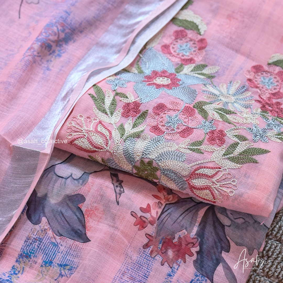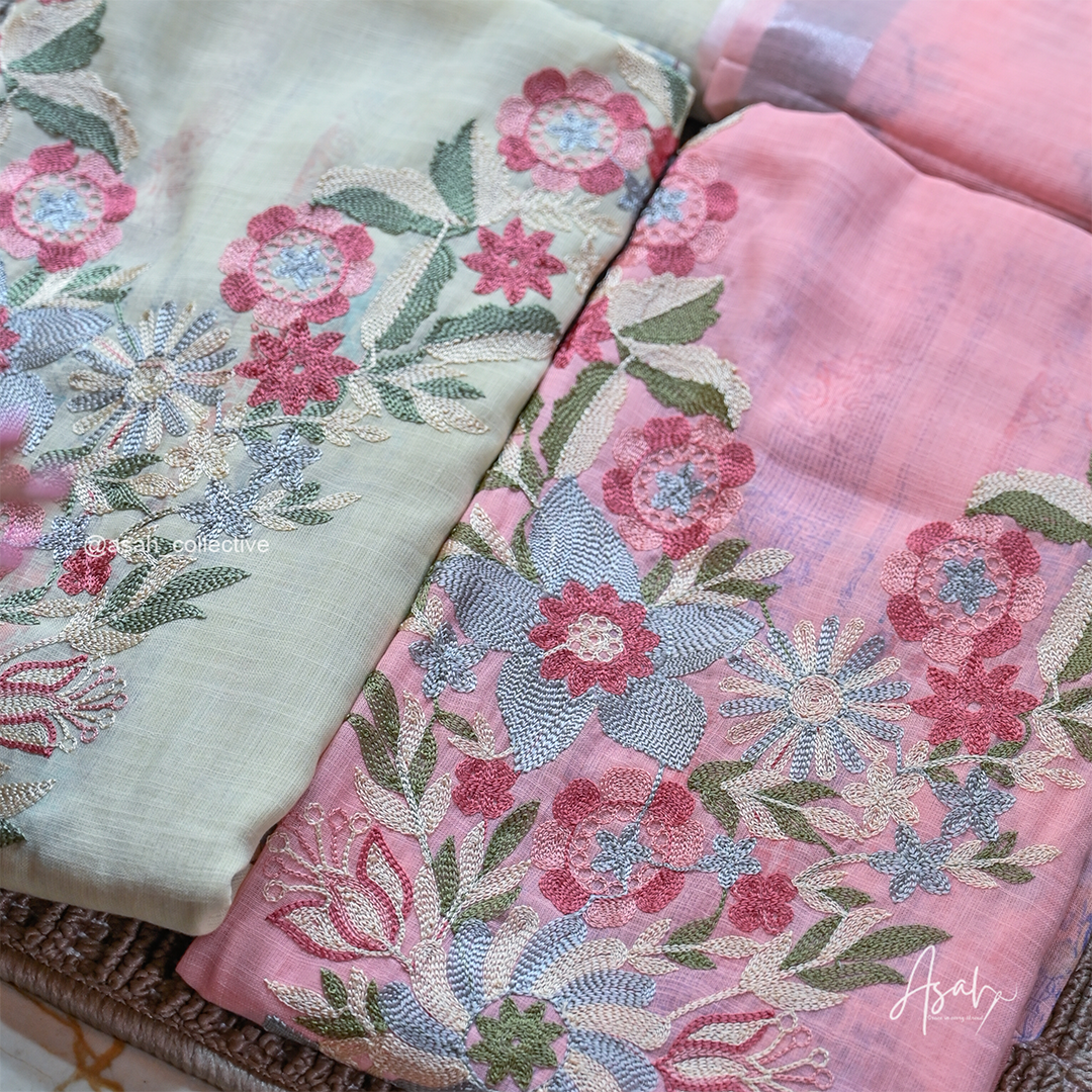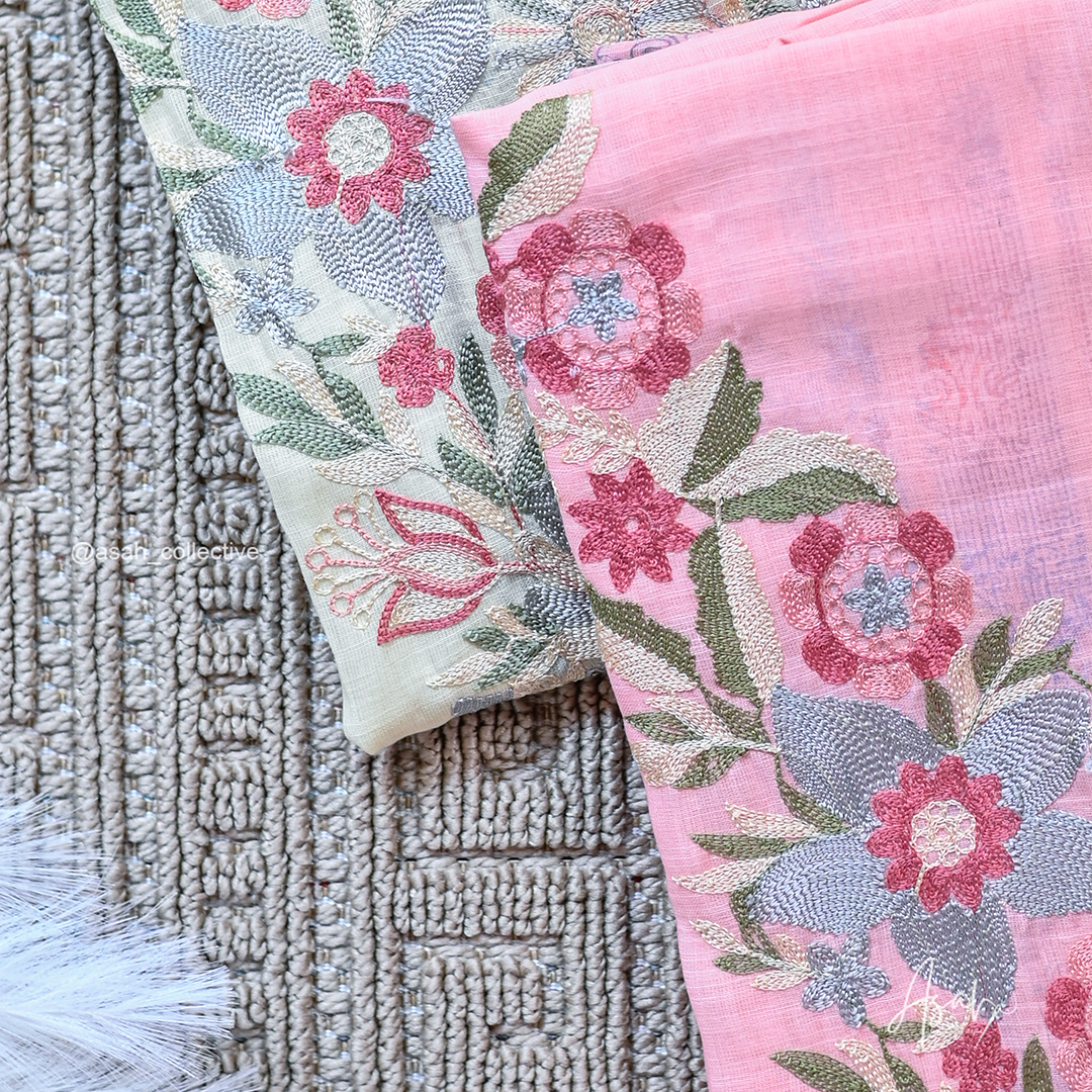 Soft cotton material with elegant V-neck silver embroidery, paired with a digital print dupatta and soft cotton bottom.