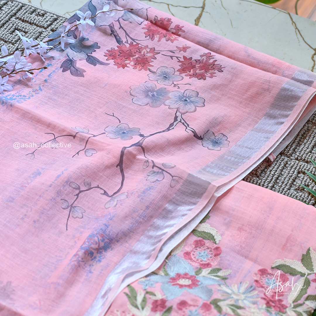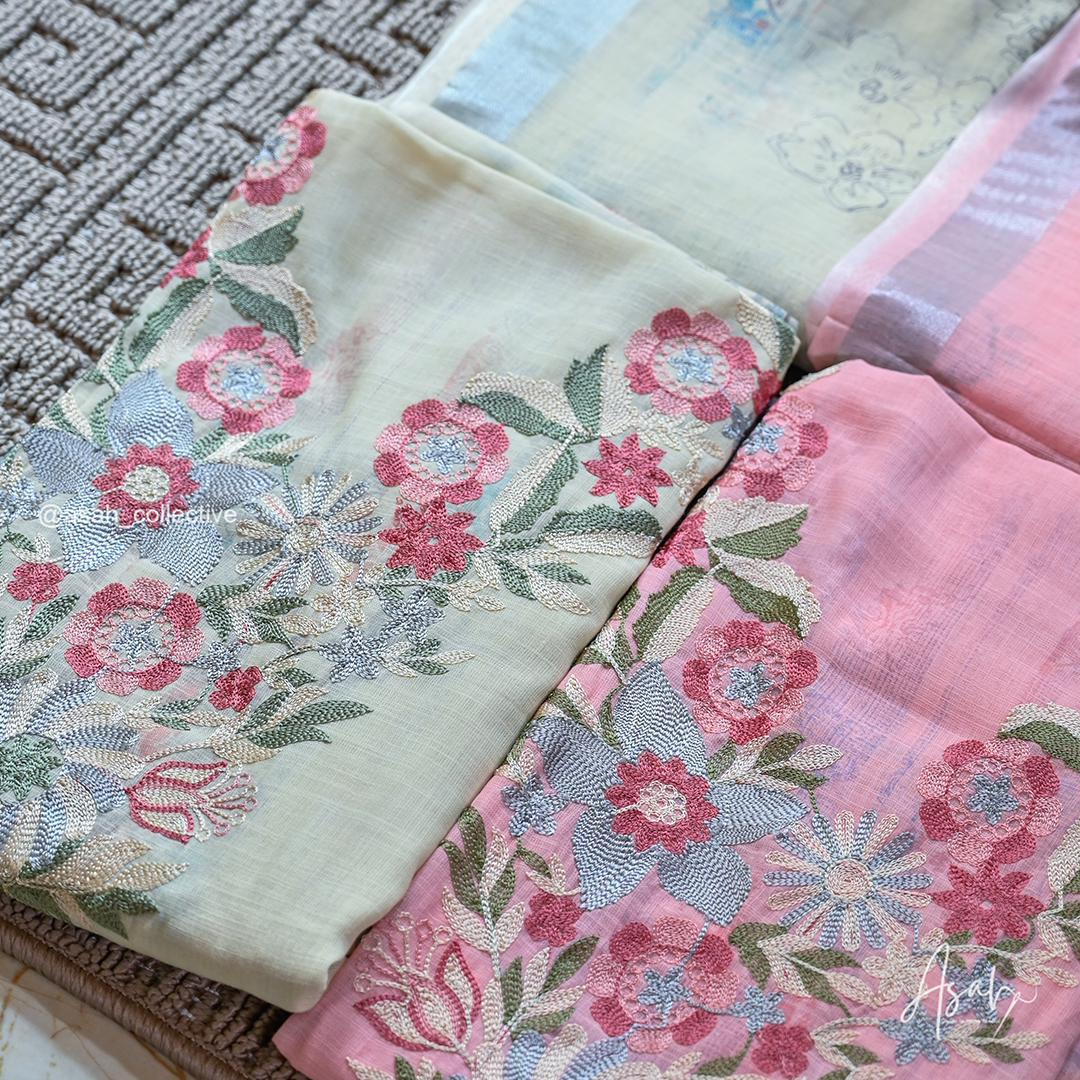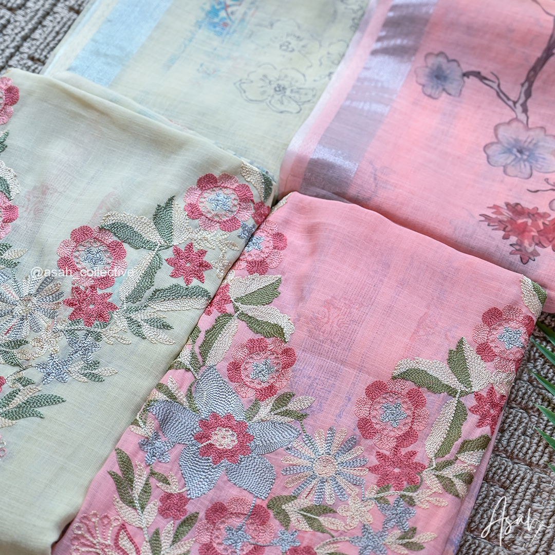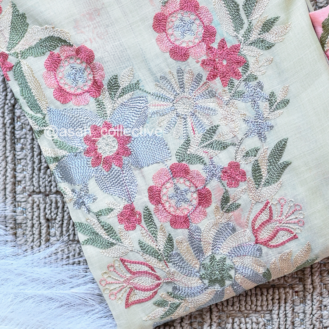 Soft cotton material with elegant V-neck silver embroidery, paired with a digital print dupatta and soft cotton bottom.
