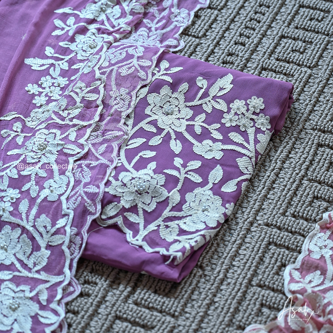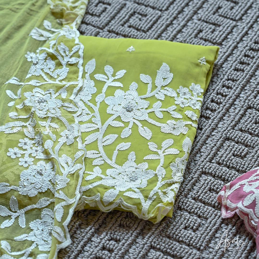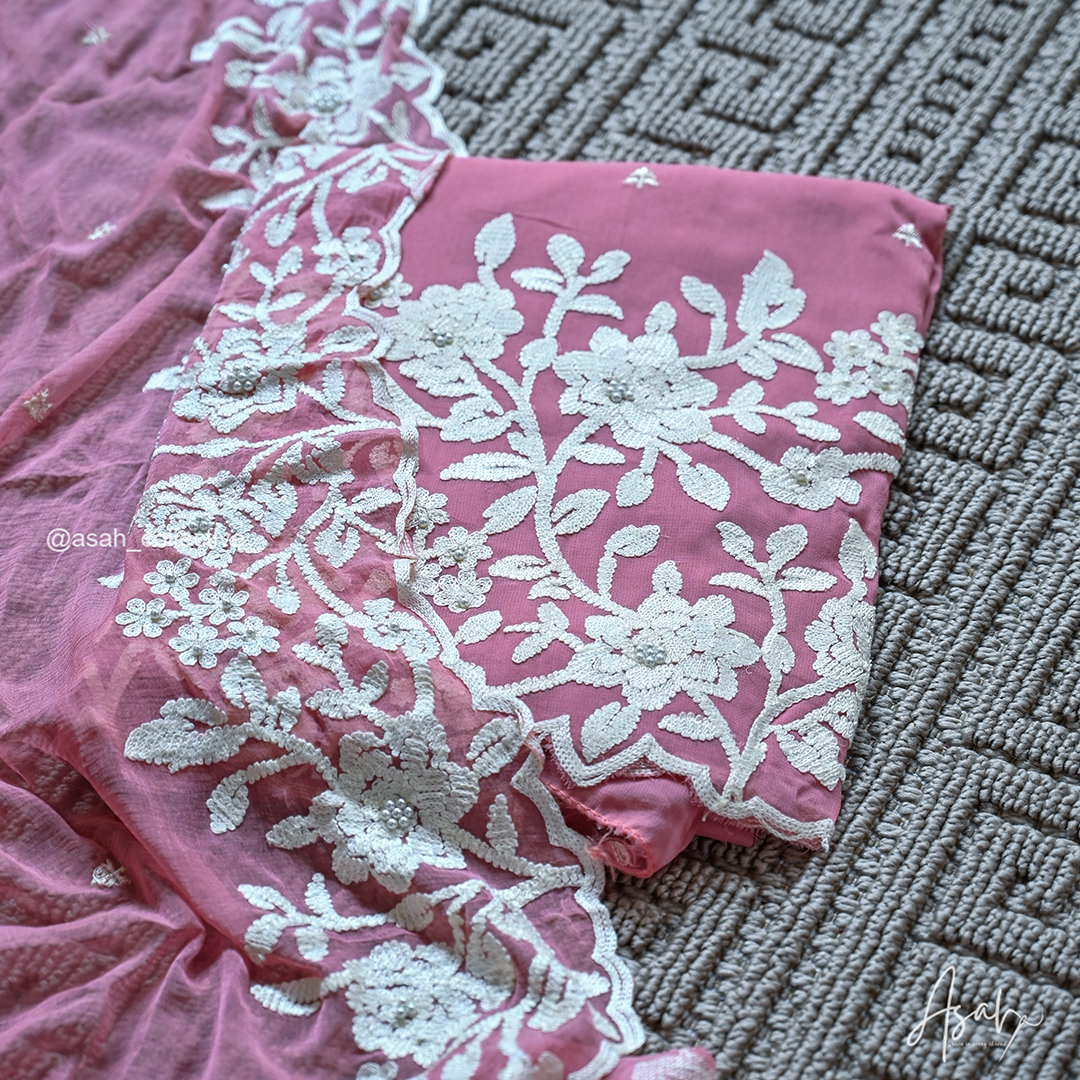Lightweight and flowy georgette fabric featuring elegant floral thread embroidery with delicate bead detailing. The set comes with a matching dupatta and plain bottom, offering a graceful and comfortable look perfect for both casual and festive wear.