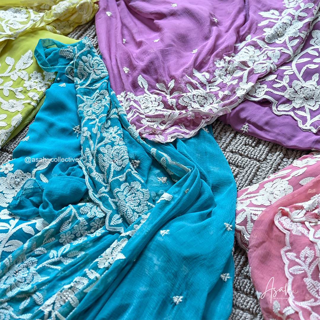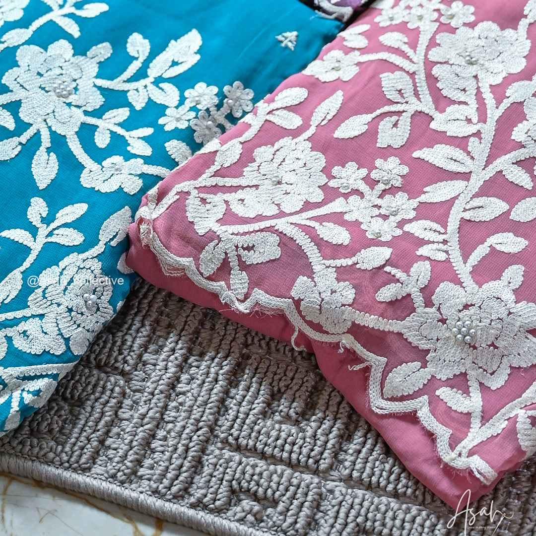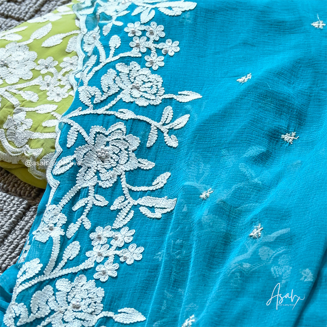 Lightweight and flowy georgette fabric featuring elegant floral thread embroidery with delicate bead detailing. The set comes with a matching dupatta and plain bottom, offering a graceful and comfortable look perfect for both casual and festive wear.